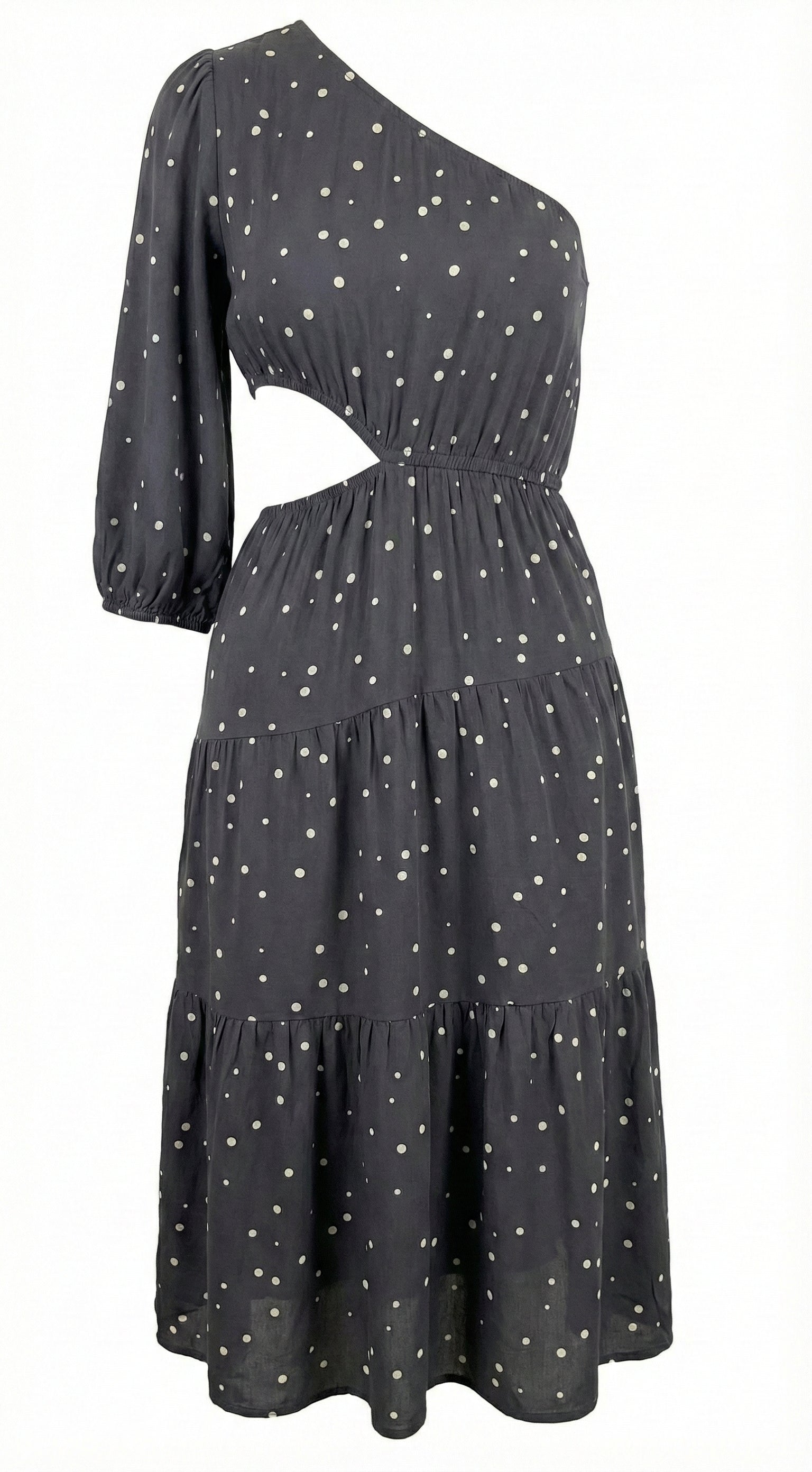 Saddle up, style queen! ๐ค Sweet meets sassy and country charm takes center stage ๐ค โ theย Girl Meets West Dress is made for twirling under string lights and stealing the show. Elevated with a one-shoulder puff sleeve, flirty side cutout, and a flowy tiered skirt, this charcoal polka dot midi isย cowgirl cute meets cool-girl chic. Itโs perfect for brunch, festivals, or catching the sunset with your besties.