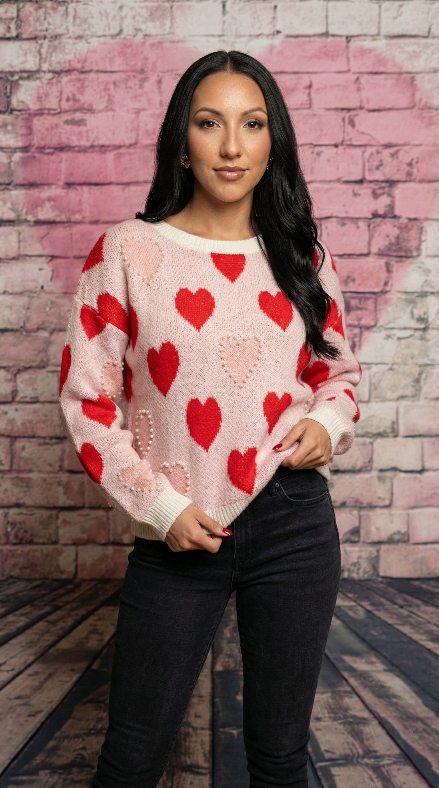 Indulge in effortless elegance with our Heart of Class Pearl Detail Sweater. Adorned with the cutest pearl-trimmed hearts, this loose-fitting sweater exudes a comfy yet sophisticated vibe. One customer wrote "I always get complimented when I go out." Perfect for any occasion, it's a must-have statement piece for the distinguished fashionista.